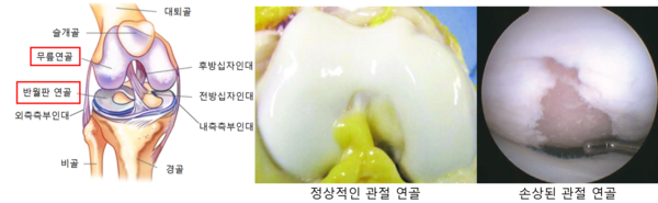 하지만 무릎의 관절연골은 어떻게 보면 반월판 연골보다 무릎에서 더 중요한 구조라 할 수 있습니다. 관절 연골이 없으면 뼈끼리 부딪히는 현상이 생기기 때문에 골멍이 발생하고, 더 진행하면 뼈가 변형되기도 합니다. 관절 주위의 뼈가 손상되는 것이 관절염의 시작입니다. 따라서 관절 연골은 관절의 손상을 막는 가장 중요한, 최후 방어선이라고 생각하시면 됩니다.