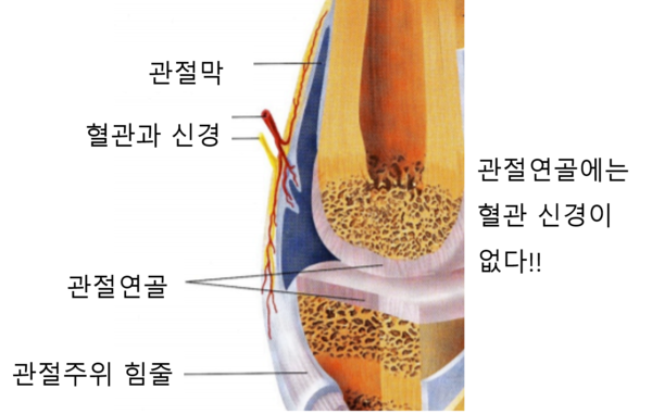 A. 치료를 알기 전에 우선 관절 연골의 구조를 알아야 합니다. 관절 연골은 혈관과 신경이 없는 구조이기 때문에 치료가 매우 까다롭습니다. 혈관이 없기 때문에 손상이 발생하면 저절로 자연회복 되는 경우는 거의 없습니다! 따라서 다양한 방법을 통해 연골 재생을 시도하고 있습니다.