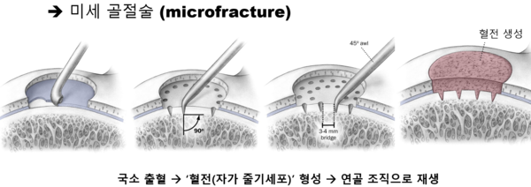 우리 피 속에는 재생세포나 줄기세포가 일정량 들어 있기 때문에, 출혈로 만들어진 혈전(피덩이)이 연골로 변하기를 기대하는 수술법입니다. 그림처럼 뼈에 구멍을 뚫어 출혈을 유도하는 수술이기 때문에 매우 간단하고 쉽게 할 수 있습니다. 그러나 이 수술은 연골 손상이 비교적 작을 때 적용할 수 있습니다. 만약 손상이 광범위하다면 적용이 불가능합니다. 병변이 너무 넓으면 출혈 후 혈전이 생기기 전에 혈액이 다 떠내려 가기 때문입니다.