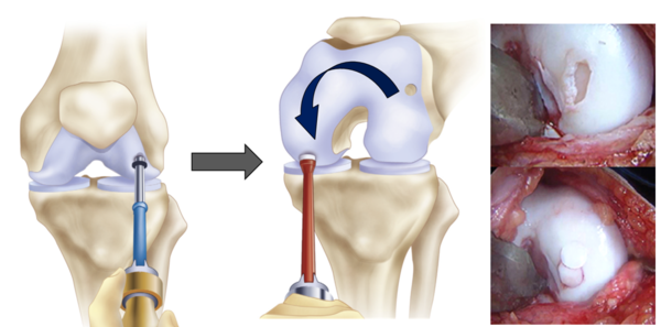 가장 쉽고 보편적으로 사용하는 수술 방법은 미세골절술입니다. 혈행이 없기 때문에 연골이 없는 부위에 뼈에 골절을 만들어 출혈을 유도하는 치료입니다.