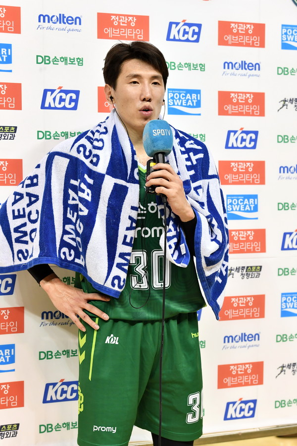 "그동안 기다려주신 감독님, 코치님들, 구단께 너무 감사드려요. 기다려준 가족들에게도 고마워요.. 오늘 (강)상재가 코를 다쳤음에도 불구하고 꼭 이기게 해주겠다는 약속을 했어요. (김)종규와 (김)영현이는 긴장하지 말라고 긴장을 풀어주더라고요. 기분이 좋네요."