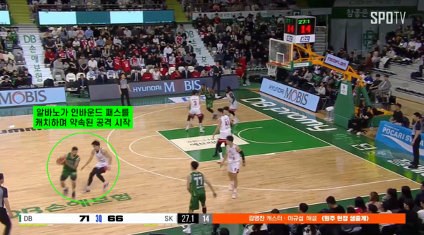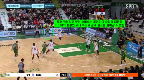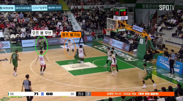 이때 두경민 쪽을 주목하자. 일반적인 경우라면 두경민이 있는 싱글 사이드(single side. 볼이 없는 공격수가 한 명만 있는 사이드. 두 명이 있을 경우 더블 사이드라고 부른다. 일반적으로 싱글 사이드냐, 더블 사이드냐에 따라 수비 팀의 헬프와 로테이션 여부가 달라진다. 실제로 많은 KBL 팀들이 싱글 사이드, 더블 사이드 여부에 따라 수비 약속을 다르게 가져간다.) 수비수인 최원혁이 알바노가 페인트존 가까이 진입하는 순간 강하게 튀어나오며 헬프를 갈 수 있었을 것이다.