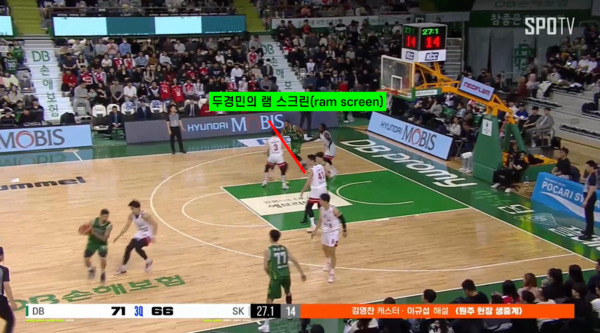 알바노를 위해 볼 스크린을 걸어줄 로슨을 위해 두경민이 먼저 다운 스크린을 걸어준다. 이처럼 볼 스크리너를 위해 제3의 스크리너가 걸어주는 다운 스크린을 램 스크린(ram screen)이라고 부른다.