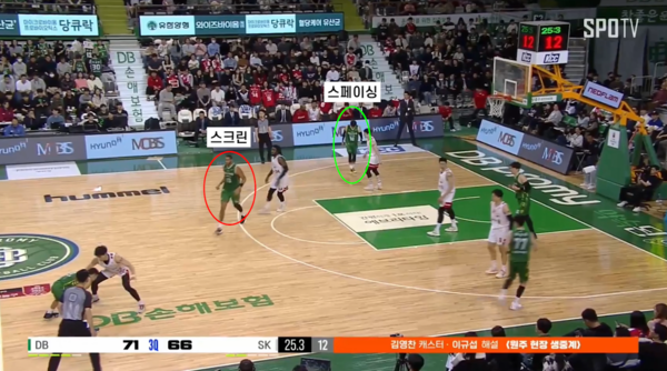 이때 두경민은 램 스크린 세팅 이후 왼쪽 윙 3점슛 라인까지 빠져나와 코트를 넓게 벌린다. 강상재와 최승욱은 각각 오른쪽 숏 코너, 오른쪽 코너에 위치, 베이스 라인에 바짝 붙어서 역시 코트를 넓게 벌리고 있는 것이 보인다.