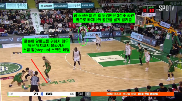 SK의 오재현이 알바노를 하프라인 앞까지 밀어내면서 강하게 압박하는 것이 보인다. 이 같은 오재현의 수비를 공략하기 위해 로슨이 알바노가 있는 높은 곳까지 올라와 스텝업 스크린을 세팅한다.