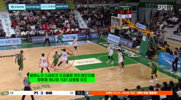 알바노가 로슨의 볼 스크린을 받은 후 8자를 그리는 '스네이크 드리블' 을 통해 넓어진 미드레인지 공간으로 진입, 순식간에 워니와 1대1 상황을 만든다. SK 역시 로슨의 팝아웃을 대비해 아예 스위치로 오재현이 로슨에게 붙어버렸다.