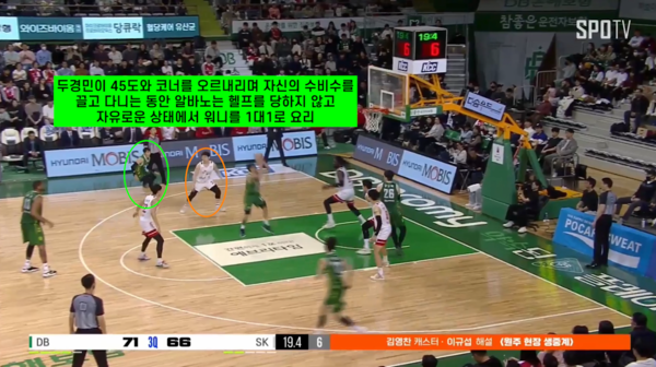 위 포제션에서 두경민은 단 한 번도 볼을 만지지 않았다. 하지만 램 스크린을 걸고 스트롱사이드 윙으로 빠진 후 자신의 뛰어난 슈팅력을 미끼로 수비수를 끌고 다니면서 알바노-로슨의 2대2 게임을 더 위력적으로 만들었다.