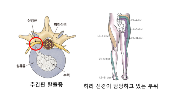 디스크 부상의 정확한 명칭은 “추간판 탈출증”입니다. 아래 그림처럼 추간판을 구성하는 외측(섬유륜)이 파열되어 물과 같은 수핵이 탈출하는 질환입니다. 이 같은 손상이 발생하게 되면 척추 주위를 지나는 신경이 압박되는데, 이로 인해 이 신경이 담당하고 있는 부위의 감각과 근육의 운동능력이 큰 지장을 받게 됩니다.