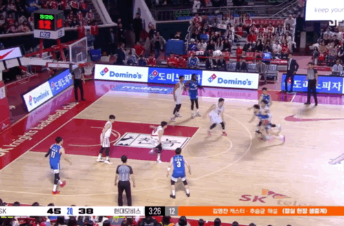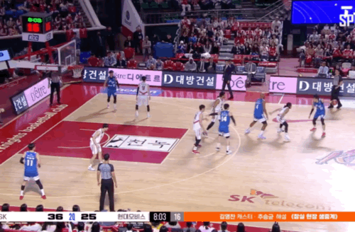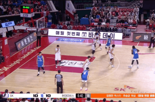 오재현이 볼을 운반해 하프라인을 넘어오자마자 SK가 리온-안영준의 더블 드래그 스크린을 활용해 3대3 게임을 세팅한다. 이때 허일영과 송창용은 양쪽 코너에 위치, 3대3 게임을 위한 스페이싱을 돕는다.