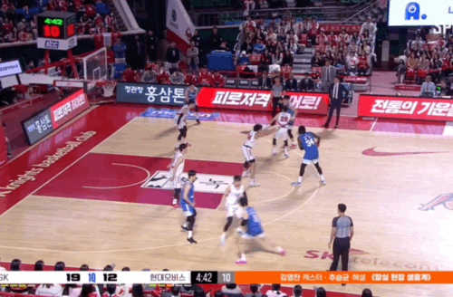 핸드오프 패스를 받은 오재현이 지체 없이 코너로 이동하는 안영준에게 패스하고, 순간적으로 현대모비스 수비 대형이 베이스라인 부근을 완전히 비워버린 것을 발견, 안영준이 폭발적인 베이스라인 돌파로 파울을 얻어낸다.