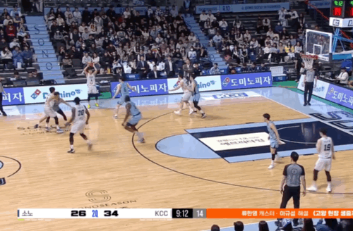 위 장면처럼 이승현의 핀다운 스크린과 라건아의 핸드오프 패스를 활용해 3대3 게임을 전개, 오누아쿠의 느린 헷지 앤 리커버리 동작과 후반기 들어 매우 불안한 소노의 수비 조직력을 이용해 라건아가 손쉬운 페인트존 득점 기회를 만들어내는 장면도 있었다.