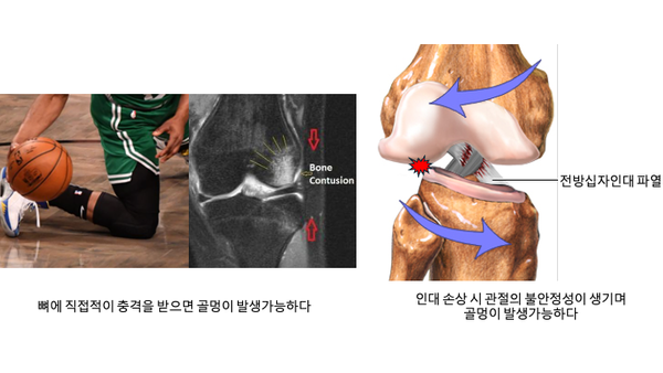 오늘은 골멍 (골타박상) 부상에 대해 알아보겠습니다. 타박상은 비정상적인 외력이 우리 몸에 직접적으로 가해지는 손상으로, 농구에서 아주 흔한 부상으로 염좌 다음으로 2번째로 흔한 부상입니다. 외력이 뼈에 직접적으로 가해졌을 때, 골멍(타박상)이 발생가능하며 영어로는 bone contusion입니다.