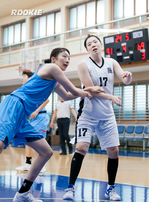 우리은행의 엄다영이 골밑에서 자리싸움을 펼치고 있다.