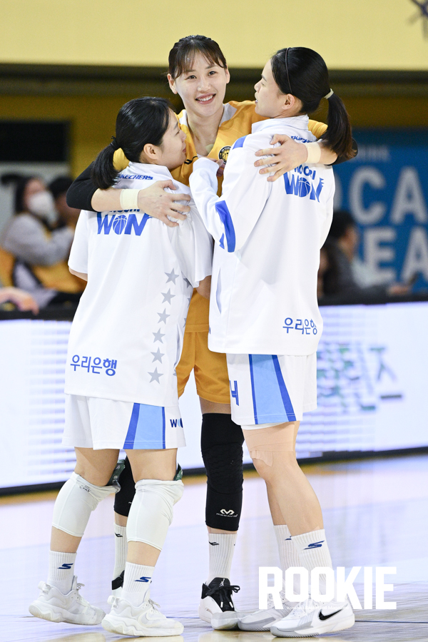 30일 청주 실내체육관에서 ‘BNK 금융 2025~2026 여자프로농구’ 청주 KB스타즈와 아산 우리은행의 경기가 열렸다. KB스타즈 강이슬이 같은 팀에서 뛰었던 우리은행 심성영과 김예진과 반갑게 인사를 나누고 있다.