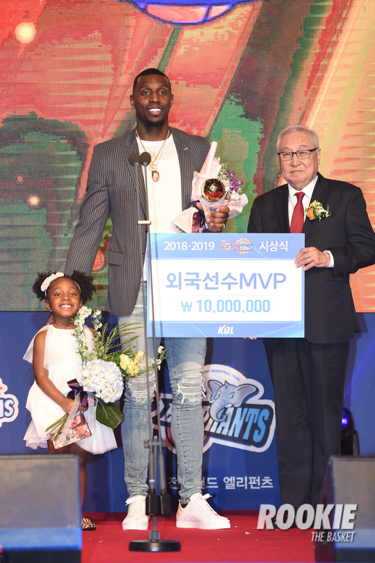 [루키=서울, 이현수 기자] 20일 서울 강남구에 위치한 그랜드 인터컨티넨탈 서울 파르나스 그랜드 볼륨에서 ’2018-19 SKT 5GX 프로농구 시상식’이 열렸다. 울산 모비스 라건아가 외국선수 MVP를 수상하였다.