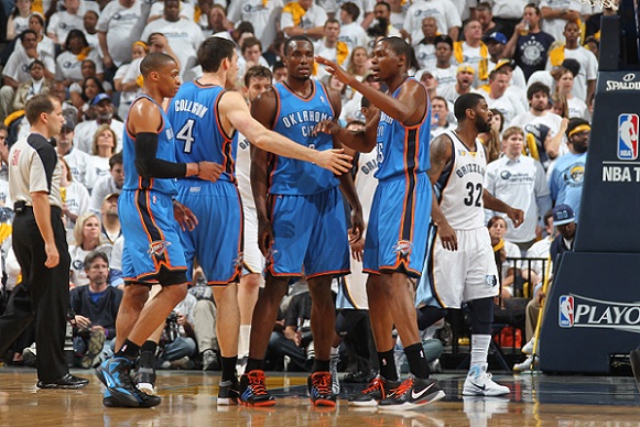 오클라호마시티는 경기종료 5분을 남긴 상황가지 90-80으로 앞섰다. 하지만 멤피스의 반격이 만만찮았다. 가솔, 메이요의 연속득점으로 추격전을 전개했고, 종료 3초를 남기고는 마이클 콘리의 3점슛으로 기어코 96-96 동점을 만들었다. 결국 웨스트브룩의 4쿼터 마지막 버저비터가 실패로 끝나며 승부는 연장전으로 넘어갔다.