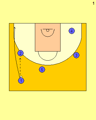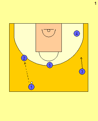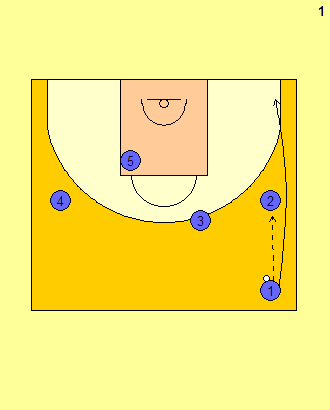 이는 피스톨 공격의 기본 움직임이다. 공을 몰고 온 O1이 O2에게 패스한다. 이후 O1은 다시 O2에게 공을 받아 돌파를 시도한다. 전형적인 기브-앤-고 동작이라고 보면 된다. 이때 상대의 수비수를 분산시키기 위해 O2는 O5의 플레어 스크린을 받아 밖으로 빠진다.