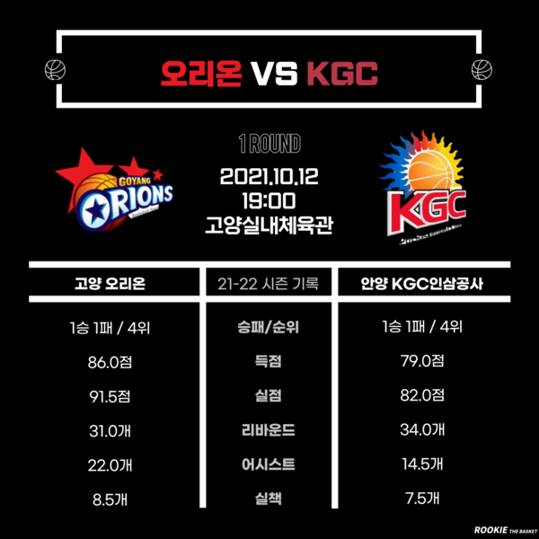12일 고양실내체육관에서는 2021-2022 KGC인삼공사 정관장 프로농구 고양 오리온 오리온스와 안양 KGC인삼공사의 1라운드 맞대결이 열린다.