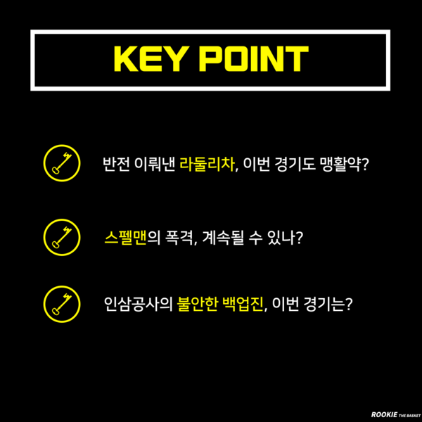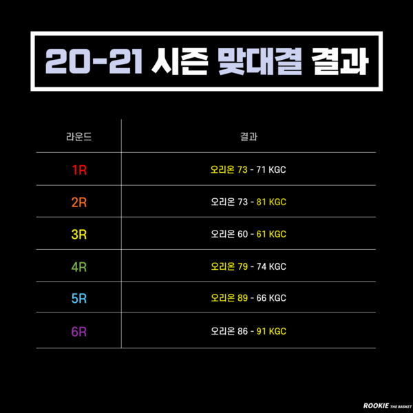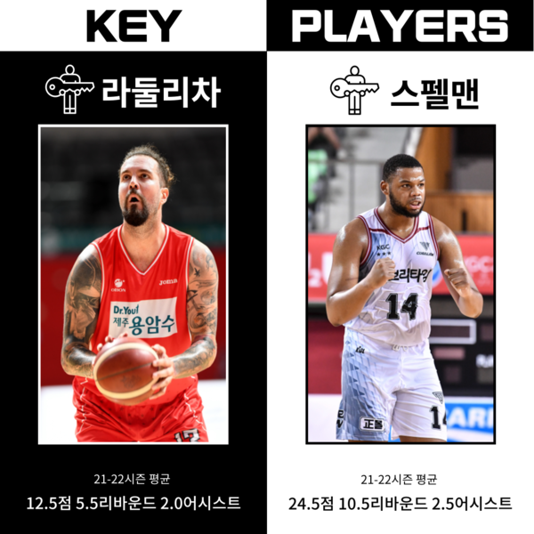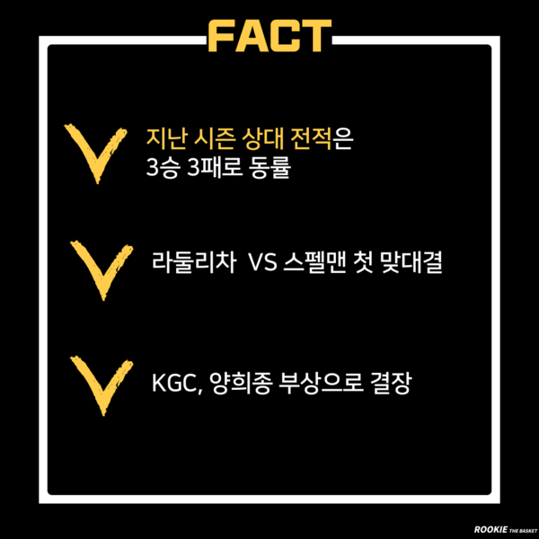 KGC 역시 외국선수 오마리 스펠맨의 활약이 대단하다. 2경기 모두 대단한 폭발력을 보이며 '넥스트 설린저'의 등장을 예고했다. KGC로서는 변준형, 전성현, 오세근 등 국내선수들이 동반 활약하는 것이 중요하다. 한편 베테랑 양희종은 부상으로 이번 경기 역시 나서지 못한다.