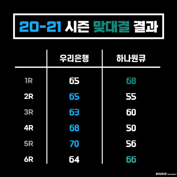 2068일 동안 이어졌던 우리은행의 하나은행 전 26연승은 지난해 1라운드 맞대결에서 깨졌다. 하지만 우리은행은 하나원큐에게 지난 시즌에도 4승 2패로 맞대결 우위를 기록했다. 여전히 하나원큐가 상대전적에서 가장 나쁜 결과를 얻고 있는 팀은 우리은행이다.