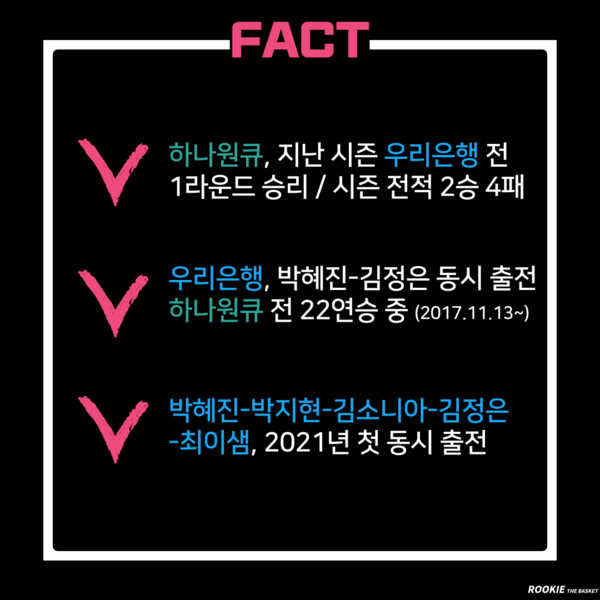 위성우 감독 부임 이후 줄곧 우승권에 머물며 강호로 평가받은 우리은행, 그리고 만년 하위권으로 하나원큐의 대결이기 때문이지만, 맞대결에서 우리은행이 무려 26연승을 달렸던 것도 중요한 이유다.