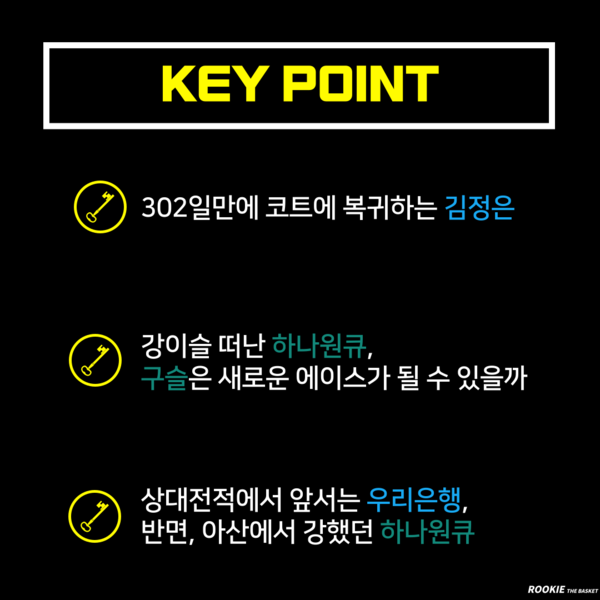 우리은행은 팀의 정신적 지주인 김정은이 복귀한다. 작년 12월 28일, 하나원큐와의 부천 경기에서 발목에 큰 부상을 당하고 시즌 아웃됐던 김정은이 302일만의 복귀전을 갖는다.