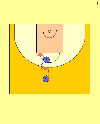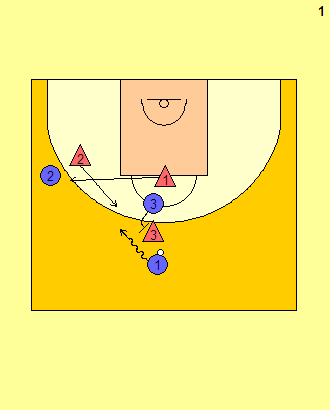 O1(제임스 하든)이 순간적으로 오픈 기회를 맞이한 O3(샘 데커)를 확인한다. O1(제임스 하든)이 패스할 때 X3(안드레 이궈달라)가 패스 경로에 서서 방해한다. 이때 X1(스테픈 커리)이 자신의 수비수로 돌아온다.