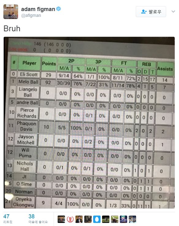 라멜로 볼의 92득점 경기 기록지 (자료 캡처 『슬램온라인』 편집장 아담 피그맨 트위터(twitter.com/afigman))