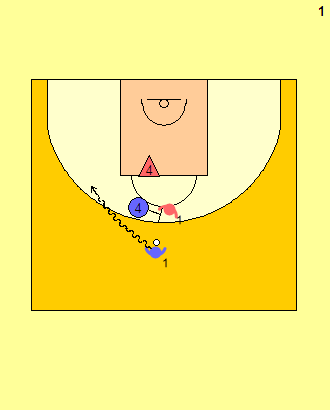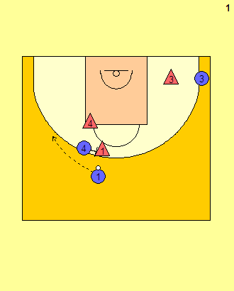 ▲ 제임스 하든(O1)이 스크린을 받아 왼쪽으로 움직이다. 카와이 레너드(X1)은 스크린을 파이트 스루 동작으로 빠져나간다. 이때 빅맨 수비수(X4)는 돌파 경로를 지키면서 하든의 동선을 제한한다.
